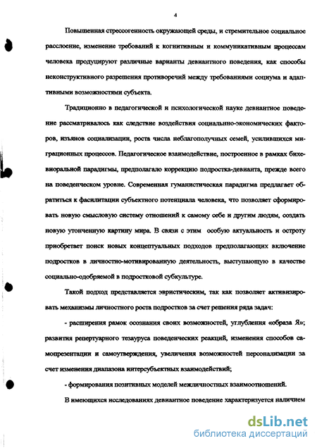 Традиционно в педагогической и психологической науке девиантное поведение рассматривалось как следствие воздействия социальино-экономических факторов, изъянов социализации, роста числа неблагополучных семей, усилившихся миграционных процессов. Педагогическое взаимодействие, построенное в рамках бихе-виоральной парадигмы, предполагало коррекцию подростка-девианта, прежде всего на поведенческом уровне. Современная гуманистическая парадигма предлагает обратиться к фасилитации субъектного потенциала человека, что позволяет сформировать новую смысловую систему отношений к самому себе и другим людям, создать новую утонченную картину мира. В связи с этим особую актуальность и остроту приобретает поиск новых концептуальных подходов предполагающих включение подростков в личностно-мотивированную деятельность, выступающую в качестве социально-одобряемой в подростковой субкультуре.