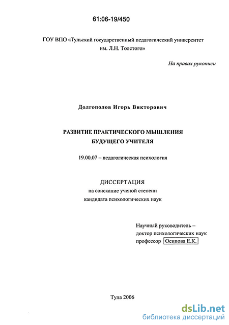 Долгополов Игорь Викторович. Развитие практического мышления будущего учителя : Дис. ... канд. психол. наук : 19.00.07 Тула, 2006 163 с. РГБ ОД, 61:06-19/450