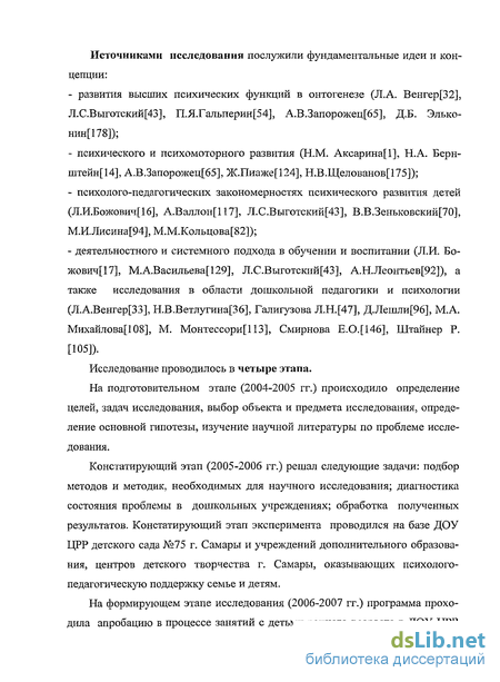 деятельностного и системного подхода в обучении и воспитании (Л.И. Бо-жович[17], М.А.Васильева[129], Л.С.Выготский[43], А.Н.Леонтьев[92]), а также исследования в области дошкольной педагогики и психологии (Л.А.Венгер[33], Н.В.Ветлугина[36], Галигузова Л.Щ47], Д.Лешли[96], М.А. Михайлова[108], М. Монтессори[113], Смирнова Е.СЦ146], Штайнер Р. [105]).