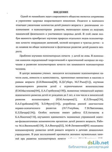 Е.А.Стребелева[150], Э.Л.Фрухт[134]), разработка ранней диагностики нервно-психического развития (Л.Г.Голубева, Г.В.Пантюхина, К.Л.Печора[134]). Особое значение имеют работы Е.Е.Антипова и Б.А.Никитюк[116], изучавших адекватность задаваемых упражнений анато-мо-физиологичеким возможностям организма детей раннего возраста. Работы М.А.Васильевой[129], Л.А.Венгера[32], М.Ф.Литвиновой[95] посвящены психомоторному развитию детей раннего возраста в детских дошкольных учреждениях. В ряде исследований признается значение музыкальных занятий при развитии психомоторных качеств ребенка (Н.А.Ветлугина [37],
