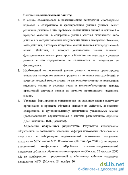 Научная новизна исследования. В исследовании проведен подробный анализ и систематизация сложившихся концепций содержания и формирования умения учиться с позиций деятельностного подхода. Впервые предложены критерии сравнения существующих представлений об умении учиться на основе деятельностной трактовки процесса учения: 1) какое место в действиях, составляющих содержание умения учиться, занимает заданное для усвоения знание (объекта, цели или ориентиров данных действий), 2) какие особенности процесса обучения выступают основными условиями формирования действий, составляющих содержание умения учиться. Показано, что в основе многообразия подходов к умению учиться лежит разное решение проблемы соотношения знаний и действий в процессе усвоения. Описана составляющая умения учиться, формирование которой содержательно связано с реализацией в обучении одного из важнейших принципов деятельностного подхода: организации усвоения знаний на основе действий, адекватных их содержанию и функциональному назначению. В эмпирическом исследовании установлено, что учащиеся, обучающиеся по программам развивающего обучения Д.Б. Эльконина - В.В. Давыдова,