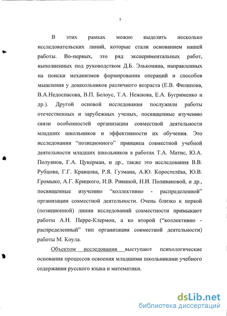 ДР-) В этих рамках можно выделить несколько исследовательских линий, которые стали основанием нашей работы. Во-первых, это ряд экспериментальных работ, выполненных под руководством Д.Б. Эльконина, направленных на поиски механизмов формирования операций и способов мышления у дошкольников различного возраста (Е.В. Филипова, В.А.Недоспасова, В.П. Белоус, Т.А. Нежнова, Е.А. Бугрименко и др.). Другой основой исследования послужили работы отечественных и зарубежных ученых, посвященные изучению связи особенностей организации совместной деятельности младших школьников и эффективности их обучения. Это исследования "позиционного" принципа совместной учебной деятельности младших школьников в работах Т.А. Матис, Ю.А. Полуянов, Г.А. Цукерман, и др., также это исследования В.В. Рубцова, Г.Г. Кравцова, Р.Я. Гузмана, А.Ю. Коростелёва, Ю.В. Громыко, А.Г. Крицкого, И.В. Ривиной, Н.И. Поливановой, и др., посвященные изучению "коллективно - распределенной" организации совместной деятельности. Очень близко к первой (позиционной) линии исследований совместности примыкают работы А.Н. Перре-Клермон, а ко второй ("коллективно -распределенный" тип организации совместной деятельности) работы М. Коула.