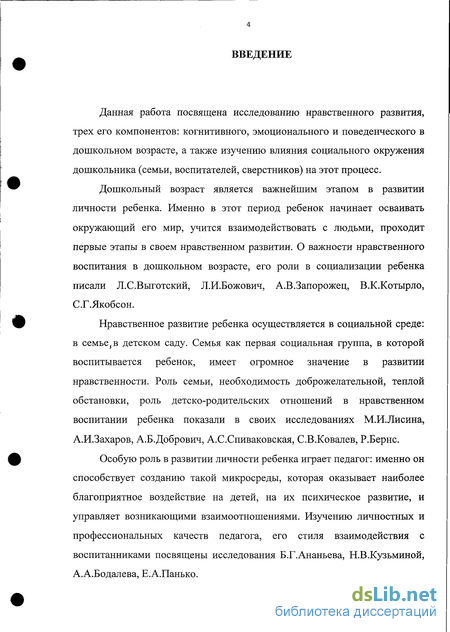 Данная работа посвящена исследованию нравственного развития, трех его компонентов: когнитивного, эмоционального и поведенческого в дошкольном возрасте, а также изучению влияния социального окружения дошкольника (семьи, воспитателей, сверстников) на этот процесс.