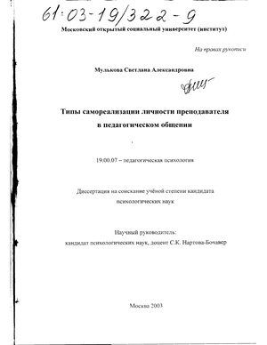 Идея профессиональной самореализации личности учителя нашла свое отражение в аналитических работах, посвященных результатам измерения уровня развития самоактуализации у учителей (С.Л. Братченко и М.Р. Миронов, A.M. Матюшкин, Н.А. Подымов, Е.Л. Яковлева), а также в исследованиях, связанных с выявлением и профессиональной актуализацией устойчивых интегральных личностных особенностей учителя (Е.В. Андриенко, О.В. Кузьменкова, А.К. Маркова, Л.М. Митина, И.И. Осадчева, В.А. Сластёнин).