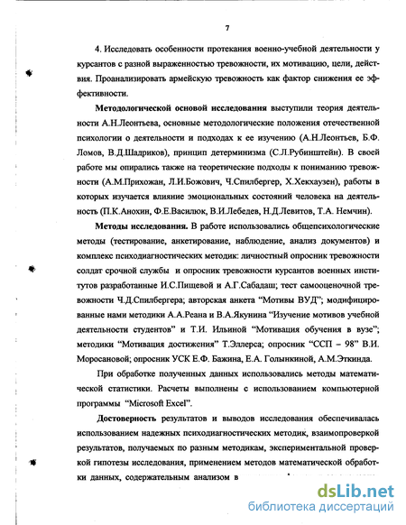 Методы исследования. В работе использовались общепсихологические методы (тестирование, анкетирование, наблюдение, анализ документов) и комплекс психодиагностических методик: личностный опросник тревожности солдат срочной службы и опросник тревожности курсантов военных институтов разработанные И.С.Пищевой и А.Г.Сабадаш; тест самооценочной тревожности Ч.Д.Спилбергера; авторская анкета "Мотивы ВУД"; модифицированные нами методики А.А.Реана и В.А.Якунина "Изучение мотивов учебной деятельности студентов" и Т.И. Ильиной "Мотивация обучения в вузе"; методики "Мотивация достижения" Т.Эллерса; опросник "ССП - 98" В.И. Моросановой; опросник УСК Е.Ф. Бажина, Е.А. Голынкиной, А.М.Эткинда.