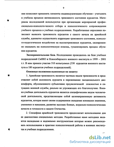 В отечественных психологических публикациях, касающихся тревожности военнослужащих (М.И.Дъяченко, В.Ф.Перевалов, В.Ф.Мисюра, Ж.Г. Сенокосов, П.И.Александрович), преимущественно рассматривается только ее воздействие на эффективность военной деятельности в напряженных ситуациях, описывается ее роль в процессе адаптации солдат и курсантов к военной службе. Анализ теоретических и экспериментальных работ показал, что проблема воздействия высокой тревожности на триаду военно-учебной деятельности - мотивацию ее освоения курсантами, целеполагание, построение их военно-учебных действий не исследована. Изучение тревожности как фактора снижения эффективности военно-учебной деятельности курсантов не выступало предметом специального психологического исследования.