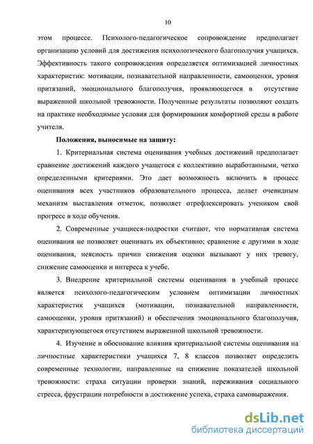 Рубинштейн и др.). Базовыми для исследования явились положения о пятикомпонентной модели оценочной деятельности (А.А. Реан), о функциях педагогической оценки (Ш.А. Амонашвили, Б.Г. Ананьев, Н.В. Кузьмина, Ю.В. Романов и др.), о содержании критериальной системы оценивания учебных достижений школьников, а также идеи В.Э. Мильман о внутренней и внешней мотивации учебной деятельности, Л.И. Божович о самооценке школьников, А.М. Прихожан о тревожности подростков.