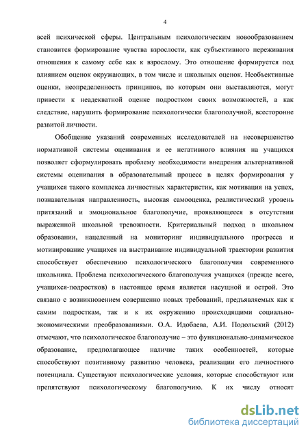 Обобщение указаний современных исследователей на несовершенство нормативной системы оценивания и ее негативного влияния на учащихся позволяет сформулировать проблему необходимости внедрения альтернативной системы оценивания в образовательный процесс в целях формирования у учащихся такого комплекса личностных характеристик, как мотивация на успех, познавательная направленность, высокая самооценка, реалистический уровень притязаний и эмоциональное благополучие, проявляющееся в отсутствии выраженной школьной тревожности. Критериальный подход в школьном образовании, нацеленный на мониторинг индивидуального прогресса и мотивирование учащихся на выстраивание индивидуальной траектории развития, способствует обеспечению психологического благополучия современного школьника (Ю.В. Романов, 2009, М.А. Ступницкая, 2008). Проблема психологического благополучия учащихся (прежде всего, учащихся-подростков) в настоящее время является насущной и острой. Это связано с возникновением совершенно новых требований, предъявляемых как к самим подросткам, так и к их окружению происходящими социально-экономическими преобразованиями. О.А. Идобаева, А.И., Подольский (2012) отмечают, что психологическое благополучие – это функционально-динамическое образование, предполагающее наличие таких особенностей, которые способствуют позитивному развитию человека, реализации его личностного потенциала. Существуют психологические условия, которые способствуют или препятствуют психологическому благополучию. К их числу относят эмоциональное благополучие, индивидуально-типологические и личностные особенности, а также психологические защиты.