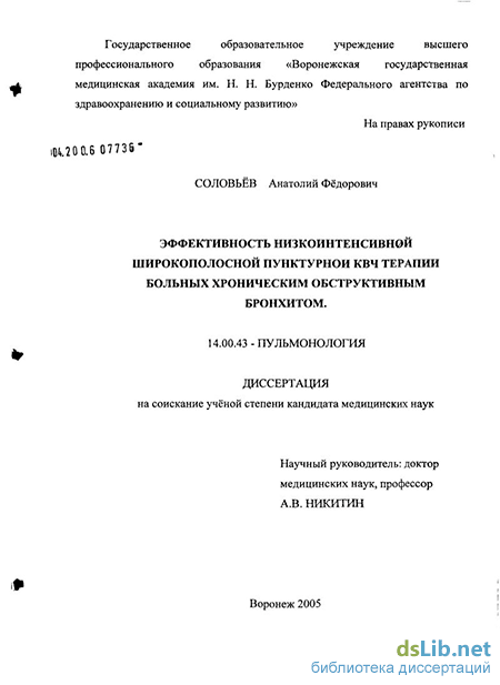 Соловьев Анатолий Федорович. Эффективность низкоинтенсивной широкополосной пунктурной КВЧ-терапии больных хроническим обструктивным бронхитом [Электронный ресурс] : Диссертация ... кандидата медицинских наук : 14.00.43