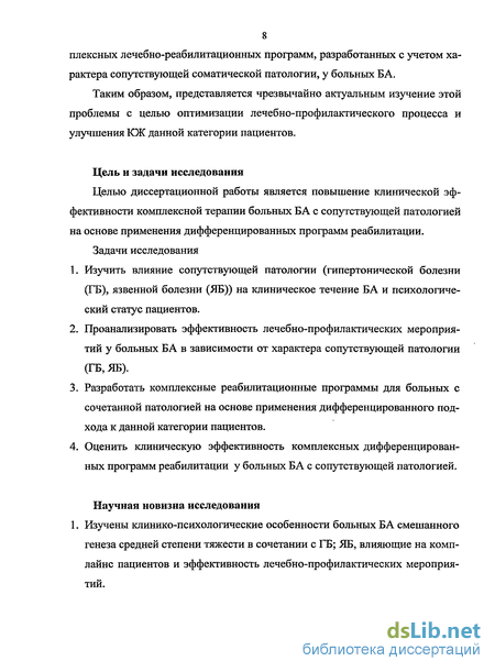 Практически отсутствуют исследования, базирующиеся на комплексной оценке влияния вышеуказанной патологии на соматический и психологический статус пациентов с БА. Многие остаются на уровне научных разработок, имеющих несомненное значение для клиники, но в практической деятельности врачей мало учитываемых и используемых. Так, в доступной нам современной литературе мы не нашли работ, оценивающих эффективность комплексных лечебно-реабилитационных программ, разработанных с учетом характера сопутствующей соматической патологии, у больных БА. Таким образом, представляется чрезвычайно актуальным изучение этой проблемы с целью оптимизации лечебно-профилактического процесса и улучшения КЖ данной категории пациентов.