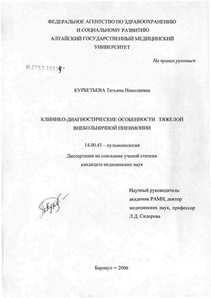Курбетьева Татьяна Николаевна. Клинико-диагностические особенности тяжелой внебольничной пневмонии : диссертация ... кандидата медицинских наук : 14.00.43 / Курбетьева Татьяна Николаевна; [Место защиты: ГОУВПО "Алтайский государственный медицинский университет"].- Барнаул, 2006.- 0 с.: ил.