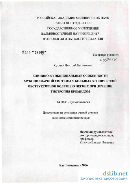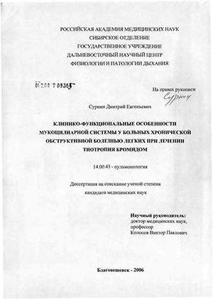 Сурнин Дмитрий Евгеньевич. Клинико-функциональные особенности мукоцилиарной системы у больных хронической обструктивной болезнью легких при лечении тиотропии бромидом : диссертация ... кандидата медицинских наук : 14.00.43 / Сурнин Дмитрий Евгеньевич; [Место защиты: ГОУВПО "Амурская государственная медицинская академия"].- Благовещенск, 2006.- 0 с.: ил.
