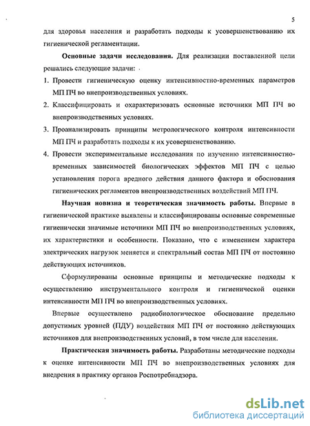 Проведенный анализ литературы позволил определить наиболее чувствительные к воздействию МП ПЧ системы организма, диапазон ожидаемого значения порога вредного действия МП ПЧ в условиях хронической экспозиции, а также вид и направление собственных гигиенических и экспериментальных исследований, призванных определить интенсивностно-временные характеристики МП ПЧ в реальных условиях контакта населения с данным фактором и уточнить значение порога вредного действия МП ПЧ.