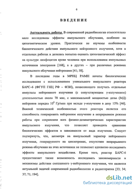В последние годы в МРНЦ РАМН начаты биологические исследования с использованием уникального импульсного реактора БАРС-6 (ФГУП ГНЦ РФ - ФЭИ), позволяющего получать отдельные импульсы нейтронного излучения (с сопутствующим у-излучением) длительностью около 70 мкс, с максимальной мощностью дозы. (МД) нейтронов порядка 109 Гр/мин при вкладе у-излучения в дозу 15% [46]. Важной технической особенностью этого реактора является его способность генерировать нейтронное излучение в непрерывном режиме работы при сохранении всех физико-дозиметрических характеристик импульсного излучения, что позволяет проводить сравнение биологических эффектов в зависимости от вида излучения. Следует подчеркнуть, что, несмотря на импульсный характер нейтронного излучения, генерируемого на циклотронах, отсутствие непрерывного режима облучения на этих источниках не позволяет адекватно исследовать эффекты импульсного воздействия. Кроме того, реактор БАРС-6 предоставляет также возможность исследовать закономерности и механизмы действия смешанного у-нейтронного излучения, что является актуальной задачей современной радиобиологии и радиотерапии [33; 34; 37; 71; 194].