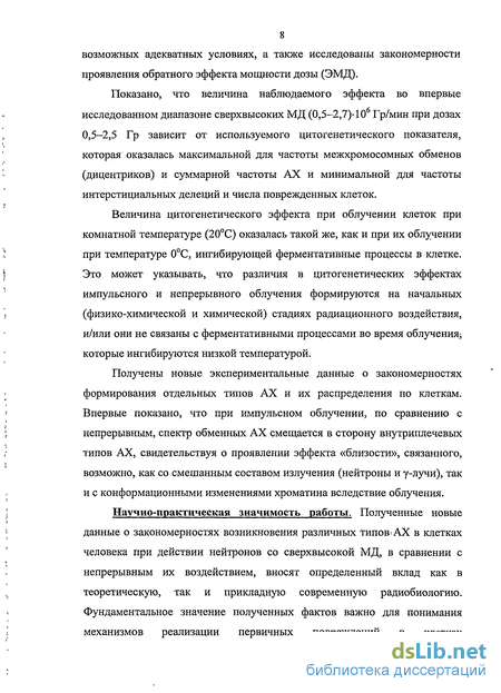 Научная новизна. В работе впервые установлена различная цитогенетическая эффективность реакторного нейтронного излучения (с сопутствующим у-излучением) при воздействии на лимфоциты крови человека в режиме одиночных импульсов со сверхвысокой МД и в режиме непрерывного облучения, обеспечивающем сравнение в максимально