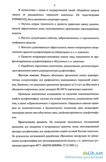 Практическая ценность. На основании проведенных исследований предложен для внедрения в ветеринарную практику вновь синтезированный препарат сульфотозифан для профилактики острой лучевой болезни животных. По результатам исследований разработана «Временная инструкция по применению сульфотозифана для противорадиационной защиты с.-х. животных» (утверждена директором ФГУ «ФЦТРБ-ВНИВИ» 27.12.2005 г.). Основные положения диссертации, выносимые на защиту.