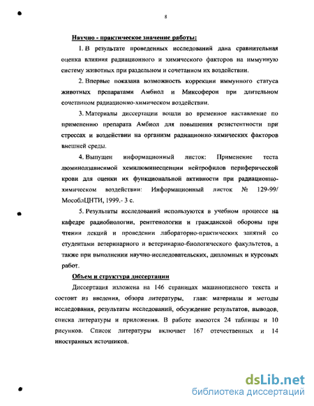1. В результате проведенных исследований дана сравнительная оценка влияния радиационного и химического факторов на иммунную систему животных при раздельном и сочетанном их воздействии.