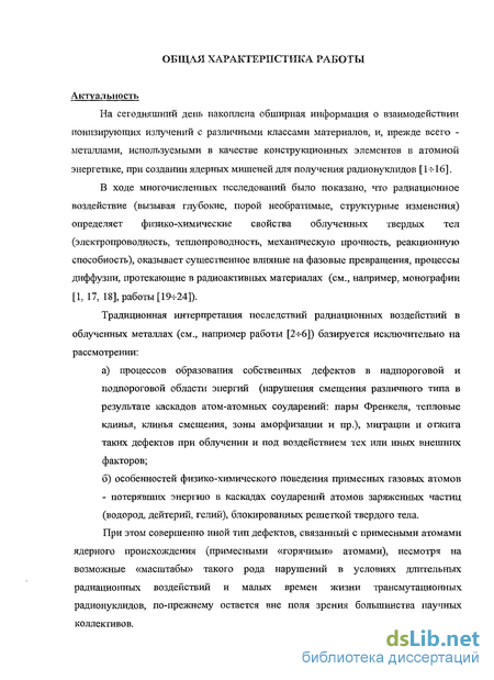 На сегодняшний день накоплена обширная информация о взаимодействии ионизирующих излучений с различными классами материалов, и, прежде всего -металлами, используемыми в качестве конструкционных элементов в атомной энергетике, при создании ядерных мишеней для получения радионуклидов [1-г16].