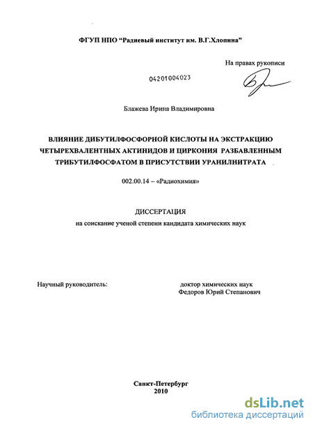 Исследованию экстракции циркония и актинидов алкилфосфорными кислотами посвящено большое количество работ. Это связано с поисками новых селективных экстрагентов для получения необходимого в промышленности циркония и для переработки жидких радиоактивных отходов, содержащих актиниды. Использование дибутилфосфорной кислоты (ДБФК) в качестве индивидуального экстрагента из-за ее сравнительно высокой растворимости в воде и склонности к образованию осадков с элементами нецелесообразно. Однако ДБФК является продуктом деградации широко используемого в промышленности трибутилфосфата (ТБФ), причем ДБФК является кислым и более сильным экстрагентом, чем нейтральный ТБФ. Поэтому ее возникновение в экстракционной системе с ТБФ приводит к изменению экстрагируемое актинидов и циркония. Особенно это сказывается при проведении реэкстракции последних разбавленными растворами кислот, так как в этих условиях ТБФ уменьшает свои экстракционные свойства, а ДБФК увеличивает.