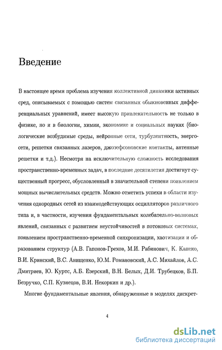 В настоящее время проблема изучения коллективной динамики активных сред, описываемых с помощью систем связанных обыкновенных дифференциальных уравнений, имеет высокую привлекательность не только в физике, но и в биологии, химии, экономике и социальных науках (биологические возбудимые среды, нейронные сети, турбулентность, энергосети, решетки связанных лазеров, джозефсоновские контакты, антенные решетки и т.д.). Несмотря на исключительную сложность исследования пространственно-временных задач, в последние десятилетия достигнут существенный прогресс, обусловленный в значительной степени появлением мощных вычислительных средств. Можно отметить успехи в области изучения однородных сетей из взаимодействующих осцилляторов различного типа и, в частности, изучения фундаментальных колебательно-волновых явлений, связанных с развитием неустойчивостей в потоковых системах, появлением пространственно-временной синхронизации, хаотизации и образованием структур (А.В. Гапонов-Грехов, М.И. Рабинович, К. Канеко, В.И. Кринский, B.C. Анищенко, Ю.М. Романовский, А.С. Михайлов, А.С. Дмитриев, Ю. Курте, А.Б. Езерский, В.Н. Белых, Д.И. Трубецков, Б.П. Безручко, СП. Кузнецов, В.И. Некоркин и др.).