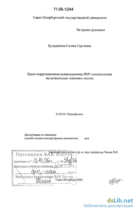 Совокупность полученных научных результатов позволяет сделать заключение о формировании нового научного направления: кросс-корреляционной релаксационной спектроскопии ЯМР мультипольных спиновых систем, которое состоит в изучении влияния коррелированных взаимодействий различной природы на релаксацию и спектры мультипольных спиновых систем; в изучении операторным методом переносов поляризации, вызванных кросс-коррелированными взаимодействиями в этих спиновых системах, с тем, чтобы создать новые импульсные методы, позволяющие селективно определять отдельные кросс-корреляционные вклады с целью получения данных о динамике и структуре молекул . Апробация работы. Основные результаты диссертационной работы были представлены на: