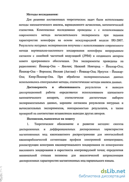 Методы исследования. Для решения поставленных теоретических задач были использованы методы математического анализа, вариационного исчисления, математической статистики. Комплексные исследования проведены с использованием современного метода вычислительного эксперимента при задании характеристик ионосферы на основе международной модели IRI-2007. Результаты натурных экспериментов получены с использованием современного метода вертикально-наклонного зондирования ионосферы непрерывным сигналом с линейной частотной модуляцией (ЛЧМ) и созданного автором нового программного обеспечения. Эти эксперименты проведены на радиолиниях: Йошкар-Ола - Яль-чик; Нижний Новгород - Йошкар-Ола; Йошкар-Ола - Воронеж; Ин-скип (Англия) - Йошкар-Ола; Иркутск- Йошкар-Ола; Кипр- Йошкар-Ола. При обработке экспериментальных данных использовались спектральные методы, статистические методы анализа данных.