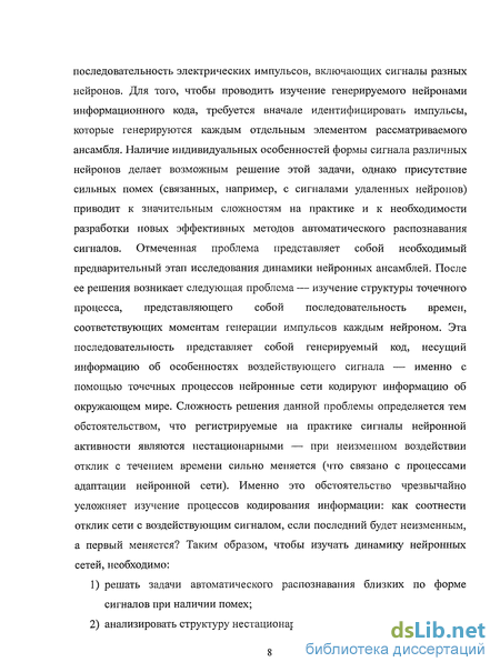 последовательность электрических импульсов, включающих сигналы разных нейронов. Для того, чтобы проводить изучение генерируемого нейронами информационного кода, требуется вначале идентифицировать импульсы, которые генерируются каждым отдельным элементом рассматриваемого ансамбля. Наличие индивидуальных особенностей формы сигнала различных нейронов делает возможным решение этой задачи, однако присутствие сильных помех (связанных, например, с сигналами удаленных нейронов) приводит к значительным сложностям на практике и к необходимости разработки новых эффективных методов автоматического распознавания сигналов. Отмеченная проблема представляет собой необходимый предварительный этап исследования динамики нейронных ансамблей. После ее решения возникает следующая проблема — изучение структуры точечного процесса, представляющего собой последовательность времен, соответствующих моментам генерации импульсов каждым нейроном. Эта последовательность представляет собой генерируемый код, несущий информацию об особенностях воздействующего сигнала — именно с помощью точечных процессов нейронные сети кодируют информацию об окружающем мире. Сложность решения данной проблемы определяется тем обстоятельством, что регистрируемые на практике сигналы нейронной активности являются нестационарными — при неизменном воздействии отклик с течением времени сильно меняется (что связано с процессами адаптации нейронной сети). Именно это обстоятельство чрезвычайно усложняет изучение процессов кодирования информации: как соотнести отклик сети с воздействующим сигналом, если последний будет неизменным, а первый меняется? Таким образом, чтобы изучать динамику нейронных сетей, необходимо: