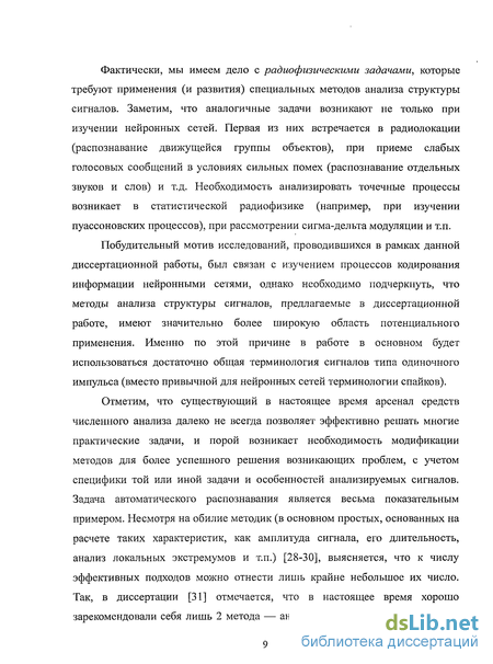 Побудительный мотив исследований, проводившихся в рамках данной диссертационной работы, был связан с изучением процессов кодирования информации нейронными сетями, однако необходимо подчеркнуть, что методы анализа структуры сигналов, предлагаемые в диссертационной работе, имеют значительно более широкую область потенциального применения. Именно по этой причине в работе в основном будет использоваться достаточно общая терминология сигналов типа одиночного импульса (вместо привычной для нейронных сетей терминологии спайков).