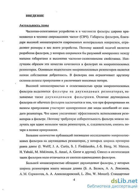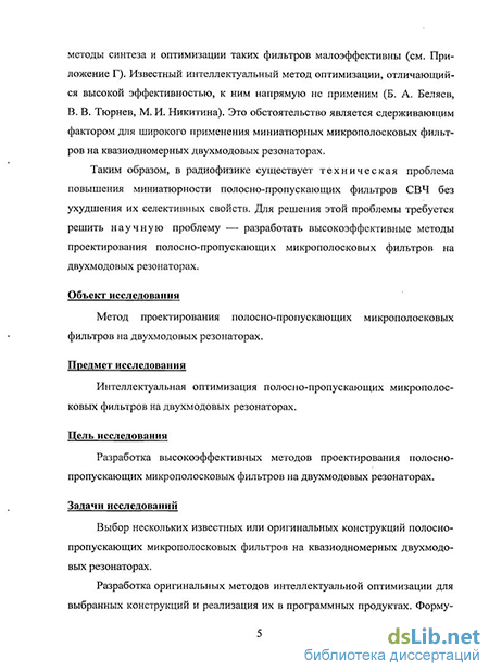 Таким образом, в радиофизике существует техническая проблема повышения миниатюрности полосно-пропускающих фильтров СВЧ без ухудшения их селективных свойств. Для решения этой проблемы требуется решить научную проблему — разработать высокоэффективные методы проектирования полосно-пропускающих микрополосковых фильтров на двухмодовых резонаторах.
