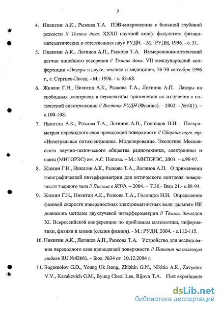 Никитин А.К., Рыжова Т.А., Логинов А.П., Головцов Н.И. Поляри-метрия переходного слоя проводящей поверхности // Сборник науч. тр.. «Интегральная оптоэлектроиика. Моделирование. Экология» Московского научно-технического общества радиотехники, электроники и связи (МНТОРЭС) им. А.С. Попова. -М.: МНТОРЭС, 2003. - с.90-97.