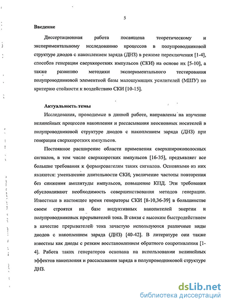 Актуальность работы. Постоянное расширение области применения сверхкоротких импульсов (СКИ) предъявляет все большие требования к формирователям таких сигналов. Основными из них являются: уменьшение длительности, повышение частоты повторения и амплитуды импульсов. Эти требования обусловливают необходимость совершенствования методов генерации импульсных сигналов. В настоящее время формирователи СКИ в большинстве своем строятся на базе индуктивных накопителей энергии и полупроводниковых прерывателей тока. Из-за высокого быстродействия в качестве прерывателей тока зачастую используются различные виды диодов с накоплением заряда (ДНЗ).
