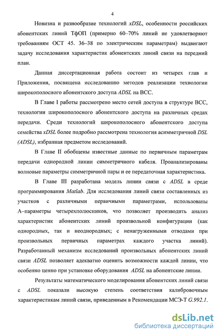 Данная диссертационная работа состоит из четырех глав и Приложения, посвящена исследованию методов реализации технологии широкополосного абонентского доступа ADSL на ВСС.