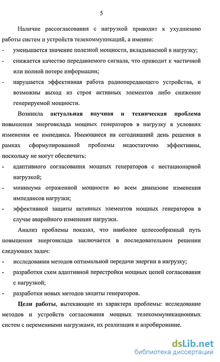 Наличие рассогласования с нагрузкой приводит к ухудшению работы систем и устройств телекоммуникаций, а именно: уменьшается значение полезной мощности, вкладываемой в нагрузку; снижается качество передаваемого сигнала, что приводит к частичной или полной потере информации; нарушается эффективная работа радиопередающего устройства, и возможны выход из строя активных элементов либо снижение генерируемой мощности. Возникла актуальная научная и техническая проблема повышения энерговклада мощных генераторов в нагрузку в условиях изменения ее импеданса. Имеющиеся на сегодняшний день решения в рамках сформулированной проблемы недостаточно эффективны, поскольку не могут обеспечить: адаптивного согласования мощных генераторов с нестационарной нагрузкой; минимума отраженной мощности во всем диапазоне изменения импедансов нагрузки; эффективной защиты активных элементов мощных генераторов в случае аварийного изменения нагрузки. Анализ проблемы показал, что наиболее целесообразный путь повышения энерговклада заключается в последовательном решении следующих задач: исследовании методов оптимальной передачи энергии в нагрузку; разработки схем адаптивной перестройки мощных цепей согласования с нагрузкой; разработки новых методов защиты генераторов. Цели работы, вытекающие из характера проблемы: исследование методов и устройств согласования мощных телекоммуникационных систем с переменными нагрузками, их реализация и апробирование.