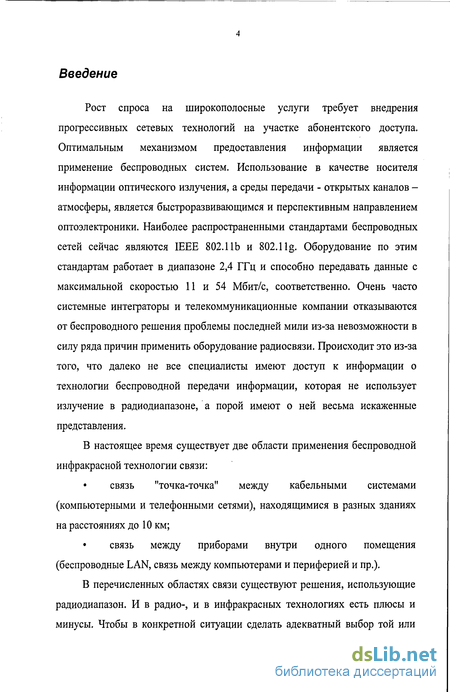 Рост спроса на широкополосные услуги требует внедрения прогрессивных сетевых технологий на участке абонентского доступа. Оптимальным механизмом предоставления информации является применение беспроводных систем. Использование в качестве носителя информации оптического излучения, а среды передачи - открытых каналов -атмосферы, является быстроразвивающимся и перспективным направлением оптоэлектроники. Наиболее распространенными стандартами беспроводных сетей сейчас являются IEEE 802.11b и 802.1 lg. Оборудование по этим стандартам работает в диапазоне 2,4 ГГц и способно передавать данные с максимальной скоростью 11 и 54 Мбит/с, соответственно. Очень часто системные интеграторы и телекоммуникационные компании отказываются от беспроводного решения проблемы последней мили из-за невозможности в силу ряда причин применить оборудование радиосвязи. Происходит это из-за того, что далеко не все специалисты имеют доступ к информации о технологии беспроводной передачи информации, которая не использует излучение в радиодиапазоне, а порой имеют о ней весьма искаженные представления.