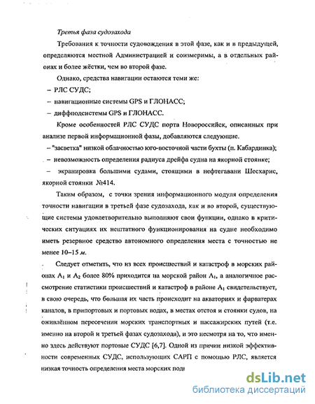 Таким образом, с точки зрения информационного модуля определения точности навигации в третьей фазе судозахода, как и во второй, существующие системы удовлетворительно выполняют свои функции, однако в критических ситуациях их нештатного функционирования на судне необходимо иметь резервное средство автономного определения места с точностью не менее 10-15 л .