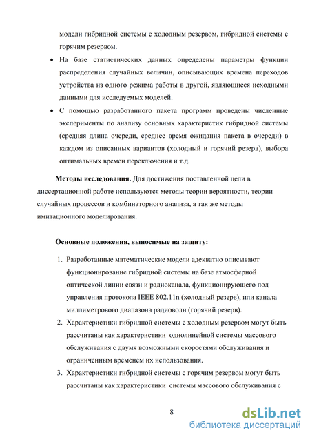 исследование гибридной системы связи, включающей атмосферную оптическую линию связи и резервный радиоканал, функционирующий под управление протокола IEEE 802.11n (холодный резерв), или резервный канал миллиметрового диапазона радиоволн (горячий резерв); разработаны математические модели для анализа эффективности работы комбинированных приемопередатчиков, позволяющие оценивать основные характеристики надежности и производительности, включая среднюю пропускную способность устройства, вероятность недоступности канала из-за ухудшения погодных условий, среднюю длину очередей пакетов и т.д.