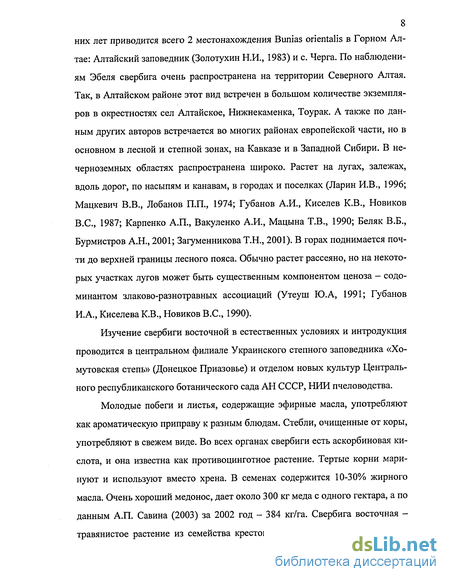Введение в культуру свербиги восточной обусловлено ее высокими кормовыми достоинствами, большим потенциалом продуктивности (35 т/га зеленой массы, 18-28 ц/га семян) и возможностью многолетнего использования, чем она выгодно отличается в хозяйственном отношении от других представителей семейства Brassicaceae. Она характеризуется засухоустойчивостью, зимо - и морозостойкостью, практически не повреждается вредителями и болезнями, неприхотлива к почвенным условиям, семена используются в технических целях для получения масла (Кшникаткина А.Н., 1996, 1998; Карпенко А.П., Вакулен-ко А.И., Мацына Т.В., 1990; Губанов И.А., Киселева К.В., Новиков В.С, 1987; Ларин И.В., 1969; Исмаилова Г.Г., 1993, 1994; Каира A.M., Головин В.П., Старченко Е.Г., Чернинов В.П., 1996; Вульф Е.В., Малеева О.Ф., 1969; Исмаилова Г.Г., 1993; Кшникаткина А.Н., Гущина В.А., Варламов В.А., 2003).