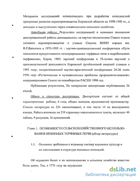 Апробация работы. Результаты исследований и основные положения диссертационной работы докладывались на научно-техническом Совете отдела полевого кормопроизводства и ученых Советах ВНИИ кормов им. В.Р.Вильямса в 1975-1995 гг. : научно-производственной конференции «Пути повышения продуктивности мелиорированных торфяных почв и выработанных торфяников», Киров, 1983: научной конференции к 75-летию научной и производственной деятельности Кировской лугоболотной опытной станции в 1993 году; межрегиональной научно-практической конференции 24-26 июля 1996 года «Региональные и муниципальные проблемы природопользования»; координационном Совете по севооборотам РАСХН 1998 год.