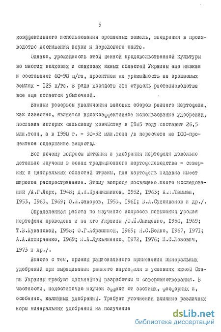 Вот почему вопросы питания и удобрения картофеля довольно детально изучены в зонах традиционного картофелеводства - северных и центральных областей страны, где картофель издавна имеет широкое распространение. Этому вопросу посвящено.много исследований /А.Г.Лорх, 1948; Д.Н.Прянишников, 1932, 1963; А.й.Таьшан, 1953, 1963, 1969; О.іл.Фаворов, 1953, 1961; Б.А.Сухоиванов и др./.