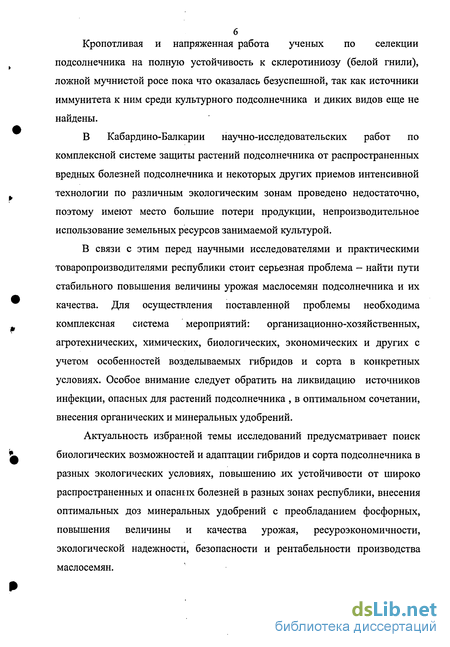 В Кабардино-Балкарии научно-исследовательских работ по комплексной системе защиты растений подсолнечника от распространенных вредных болезней подсолнечника и некоторых других приемов интенсивной технологии по различным экологическим зонам проведено недостаточно, поэтому имеют место большие потери продукции, непроизводительное использование земельных ресурсов занимаемой культурой.