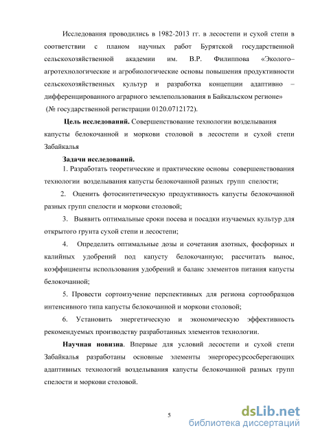 Научная новизна. Впервые для условий лесостепи и сухой степи Забайкалья разработаны основные элементы энергоресурсосберегающих адаптивных технологий возделывания капусты белокочанной разных групп спелости и моркови столовой. Проведена сравнительная оценка новых сортов и гибридов раннеспелой и среднеспелой капусты белокочанной и моркови столовой, выявлены наиболее продуктивные сорта и гибриды; установлены оптимальные сроки посадки капусты белокочанной и посева моркови столовой, позволяющие дифференцированно и рационально использовать природные условия. Установлены оптимальные, экологически безопасные и экономически обоснованные дозы и сочетания азотных, фосфорных и калийных удобрений под капусту белокочанную, вынос и коэффициенты использования удобрений, баланс элементов питания для аллювиальной луговой почвы, а также наиболее эффективные регуляторы роста. Определено качество исследуемых овощных культур в зависимости от применяемых элементов технологии. Для условий зон региона приведена энергетическая и экономическая оценка системы применения агротехнических приемов.