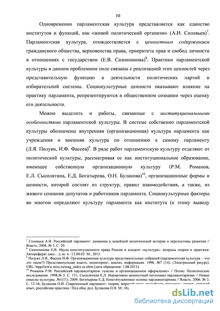 Степень разработанности проблемы. Феномен парламентской культуры рассматривается в нашем исследовании как концепт, который фокусирует целостность проявлений парламентской культуры в ее ценностных установлениях (мировоззренческих, теоретических, экономических, философских, художественных и др.), институционально закрепленных (декларации, документы, кодексы, конституционные и правовые уложения), в аксиологических моделях парламентских институтов и в антропологических практиках, определяемых политической деятельностью граждан и профессиональных политиков, политическими отношениями, целостной политической культурой.