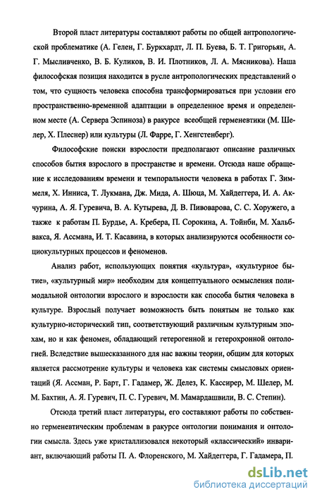 Второй пласт литературы составляют работы по общей антропологической проблематике (А. Гелен, Г. Буркхардт, Л. П. Буева, Б. Т. Григорьян, А. Г. Мысливченко, В. Б. Куликов, В. И. Плотников, Л. А. Мясникова). Наша философская позиция находится в русле антропологических представлений о том, что сущность человека способна трансформироваться при условии его пространственно-временной адаптации в определенное время и определенном месте (А. Сервера Эспиноза) в ракурсе всеобщей герменевтики (М. Ше-лер, X. Плеснер) или культуры (Л. Фарре, Г. Хенгстенберг).
