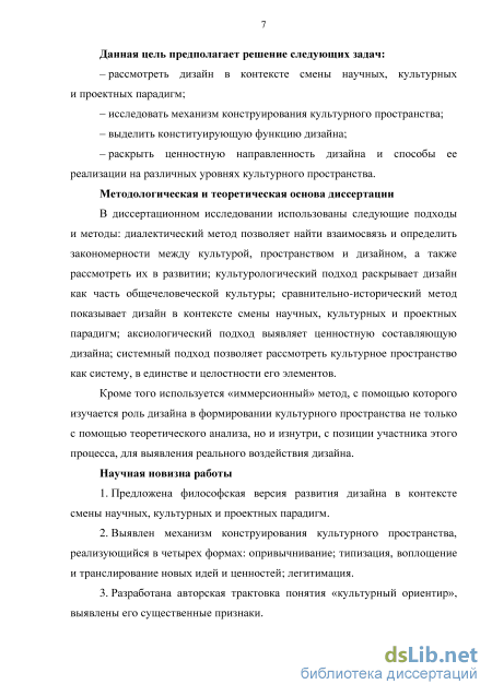 Целью диссертационного исследования является выявление роли дизайна в формировании культурного пространства.