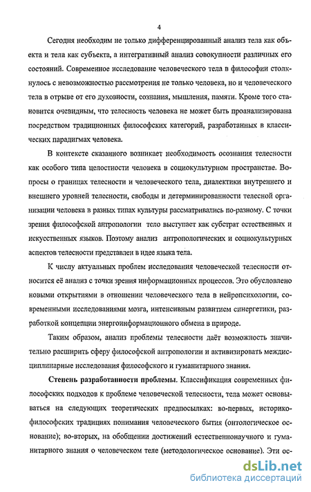 Степень разработанности проблемы. Классификация современных философских подходов к проблеме человеческой телесности, тела может основываться на следующих теоретических предпосылках: во-первых, историко-философских традициях понимания человеческого бытия (онтологическое основание); во-вторых, на обобщении достижений естественнонаучного и гуманитарного знания о человеческом теле (методологическое основание). Эти ос нования достаточно подвижны и могут быть взаимодополняемы при анализе современного уровня философского осмысления проблемы телесности.