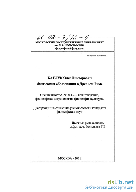 В-третьих, теоретически значимой данную тему делает тот факт, что последние годы ознаменованы растущим интересом к этой проблематже именно в нашей стране, среди российских ученых. Об этом свидетельствует целый ряд публикаций и исследований. Так, только в 1999 году журнал «Вопросы философии» уделил внимание этой проблематике в двух своих номерах^. Другое издание, «Философские исследования», также подготовило специальную рубрику^. Недавно на русском язьпсе вьппло два учебных пособия: в 1999 году «Философия и история образования» Л.А. Степашко, в 2000 году - «Введение в философию образования» Э.Н. Гусинского и Ю.И. Турчаниновой. Однако, в этой связи обращение к теме «философия образования в Древнем в Риме» не следует считать лишь данью некой научной моде. Как отмечают многие современнью авторы, уделяюпще внимание данному направлению исследования, эта область анализа в настоящее время находится в стадии становления. И.В. Бесстужев-Лада отмечает: «А философы эту отрасль философии своим вниманием, увы, не балуют, хотя сегодня, имея в виду состояние образования в нашей стране, она принадлежит к разряду актуальнейщих»^. Сходную оценку дают Э.Н. Гусинский и Ю.И. Турчанинова: «В нашей стране ни сама эта научная дисциплина, ни соответствующий учебный предмет практически не существуют»Поэтому изучение историко-философских истоков основного круга тем и вопросов, обсуждаемых в рамках философии образования, может оказаться полезным при определении статуса подобной дисципжны в современном научном знании.