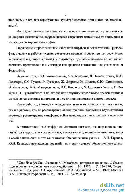 Как в работах, в которых исследователи шли от метафоры к пониманию, так и в работах, где от рассмотрения общих проблем понимания осуществлялся переход к рассмотрению метафоры, война неоднократно оказывалась в поле зрения.