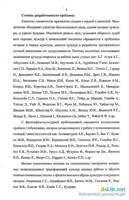 Единство человечества признается сегодня и наукой и религией. Человечество объединяет единство биологического вида, единая история культуры, и единое будущее. Мыслители разных эпох, осознавая общность судеб всех народов, культур и цивилизаций постоянно обращаются к проблемам истории и теории культуры, диалога культур и разработки критериальных условий повышения его продуктивности. Поэтому настоящее исследование коэволюции культур опирается на работы таких ученых как: А.Г. Агаев А.Г., Абдуллаев А.И., Аникович М.В., Арутюнян А.А., Ауробиндо Гхош, Белоко-нев Г.П., Бердяев Н.А., Боас Ф., Бьюкенен П., Волков Ю.Г., Гегель Г., Гердер И,, Давидович В.Е., Данилевский Н.Я., Дьяконов И.М., Драч Г.В., Жданов Ю.А., Зигуненко С.Н., Ионов И.Н., Каган М., Коган Е.Я., Ковалев A.M., Конрад Н.И., Коротаев А.Н., Леви-Стросс К., Малиноеский Б., Мамарда-швили М.К., Матяш Т.П., Петров М.К., Поликарпов B.C., Режабек Е.Я., Рубинштейн С.Л., Сорокин П.А., Степин B.C., Тейяр де Шарден, Тойнби А., Тэйлор Э., Уайт Л., Федотова В.Г., Фуко М., Хабермас Ю., Хайдеггер М., Шведов М.Ш., Шпенглер О., Шустова A.M., Яковец Ю.В., Яновский Р.Г., Ясперс К., Davis J., Diamond J., Klosterman Ch., Miller Т., Witkin R.W. и др.