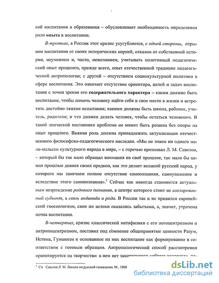 В-третьих, в России этот кризис усугубляется, с одной стороны, отрывом воспитания от своих исторических корней, отказом от собственной истории, неумением и, часто, нежеланием, учитывать позитивный педагогический опыт прошлого, прежде всего, опыт отечественной традиции педагогической антропологии; с другой - отсутствием социокультурной политики в сфере воспитания. Это означает отсутствие ориентира, целей и задач воспитания с точки зрения его содержательного характера - каким должно быть воспитание, чтобы помочь человеку найти себя и свое место в жизни и встретить достойно тяжкие испытания; какими должны быть школа, ребенок, учитель, родители; и что должен делать человек, чтобы остаться человеком. В такой эпической постановке проблема не может быть решена без опоры на опыт прошлого. Важная роль должна принадлежать актуализации отечественного философско-педагогического наследия. «Мы не знаем ни одного мало-мальски культурного народа в мире, - с горечью признавал Л. М. Савелов, - который бы так мало обращал внимания на своё прошлое, так мало бы ценил прошлые деяния своих предков, как это делает великий русский народ, у которого мы замечаем полное отсутствие самосознания, самоуважения и вследствие этого самопознания».1 Сейчас как никогда становится актуальным возрождение родового познания, в центре которого стоит не изолированный субъект, а связь индивида и рода, В России так и не привился европейский гносеологизм, свои же истоки оказались забытыми, а, значит, утрачена почва воспитания.
