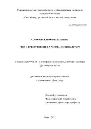 Изучая моральную и правовую оценки преступления в русской православной культуре, мы обращались к работам К. М. Азадовского, Ю. И. Александрова, В. В. Ахматова, Н. А. Бердяева, С. Н. Булгакова, Ю. С. Бернадской, Макария Булгакова, В. Даля, еп. Диоклийского Каллиста (Уэр), Л. М. Дмитриевой, П. В. Добросельского, Ф. М. Достоевского, Т. Драйзера, А. А. Керновского, И. Г. Пендиковой, Д. В. Пивоварова, М. Е. Салтыкова-Щедрина, арх. Сергия Старогородского, Д. М. Федяева.